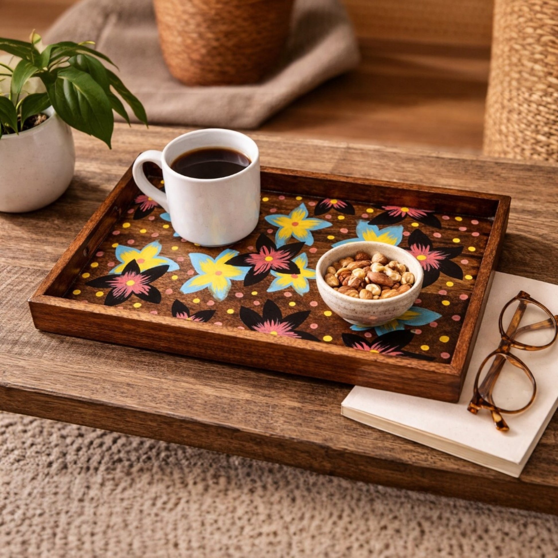 Hand-Painted Wooden Serving Tray – Mango Wood Floral Tray for Home, Kitchen & Décor