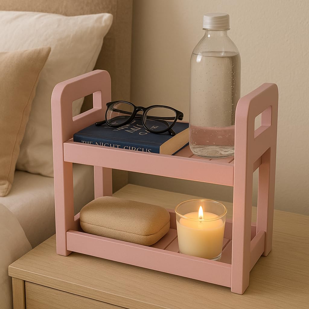 Add a stylish yet practical touch to your countertop with this pink 2-tier wooden storage rack from Wood Curls. Ideal for kitchens, bathrooms, or workspaces, its two spacious shelves hold towels, toiletries, spices, and more while saving space vertically. Crafted from durable engineered wood, it offers lasting stability and a sleek modern design with clean lines. The soft pink finish adds a gentle pop of color that blends effortlessly with various decor styles. Compact yet versatile, this organizer keeps essentials tidy and within easy reach, enhancing both order and charm in your space.