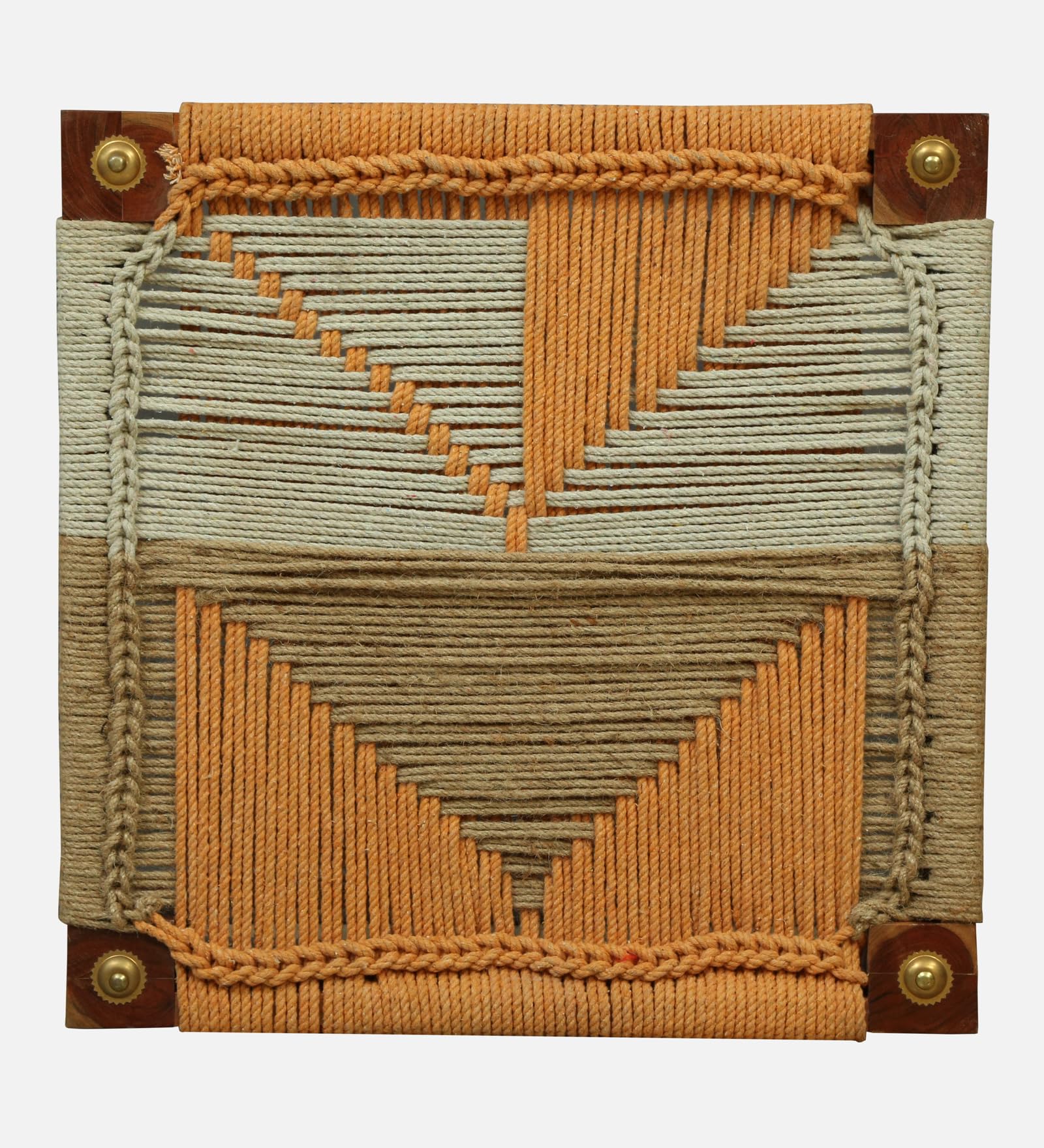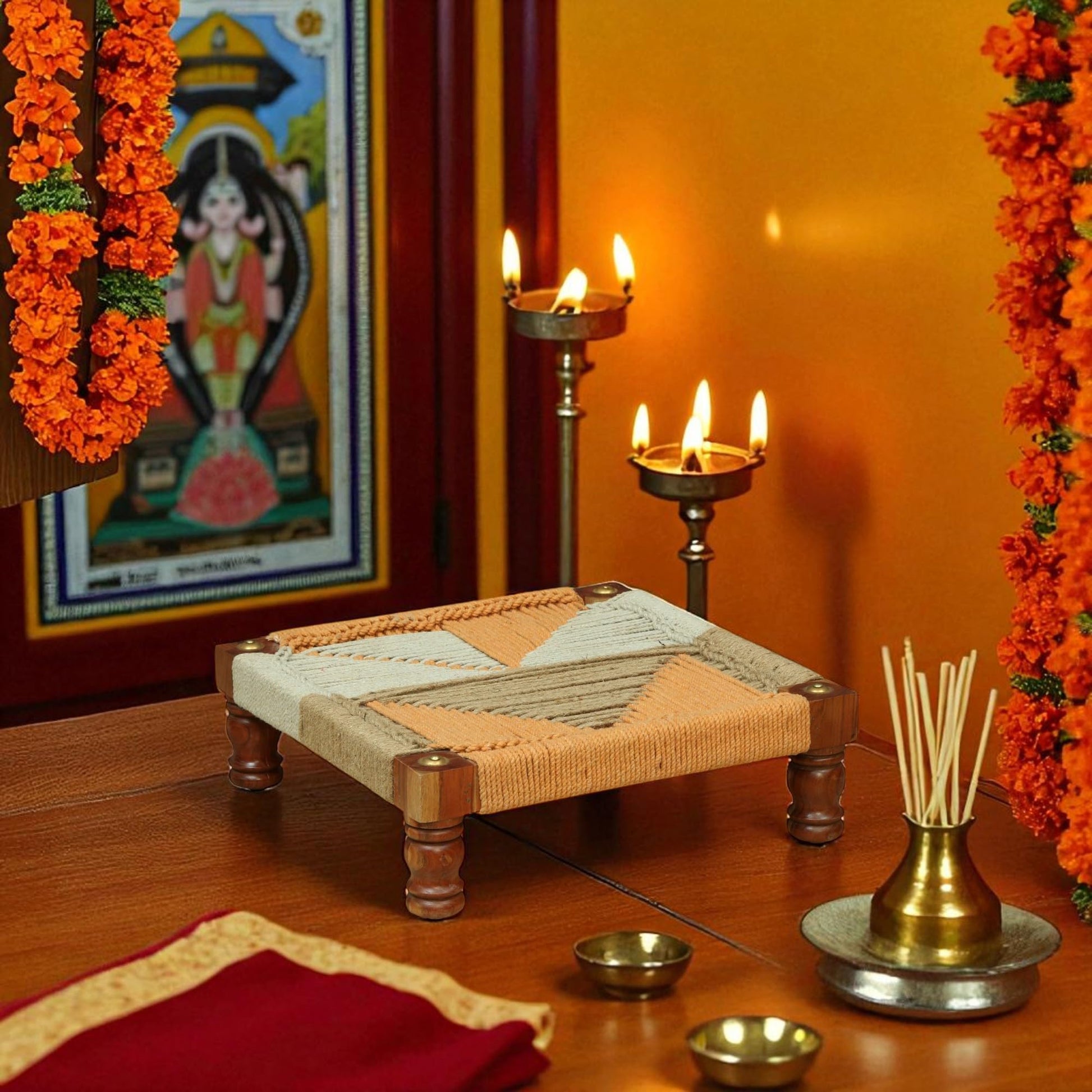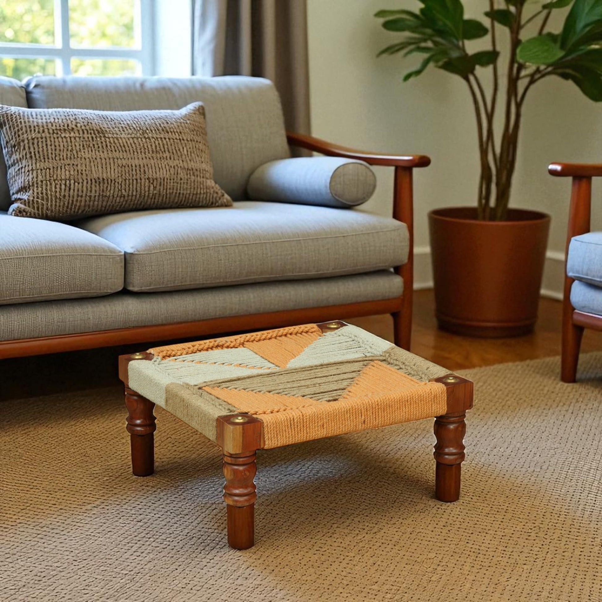 This Wood Curls handwoven wooden chowki combines expert craftsmanship with practical design. Measuring 20 inches in length and 7 inches in height, its sturdy wooden frame features durable, intricately woven rope work in natural and peach tones, creating a distinctive geometric pattern. Ideal for traditional seating, as a meditation table, footrest, or puja stool, its compact size fits seamlessly into diverse decor styles, offering both cultural elegance and functional comfort.
