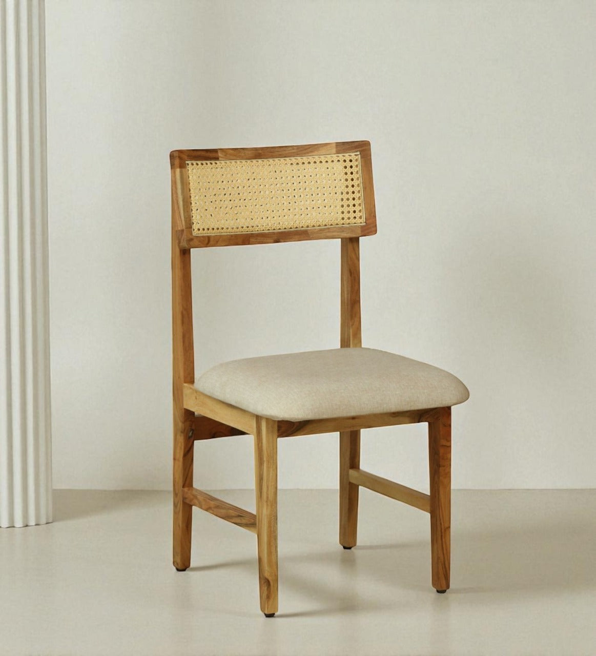 The Wood Curls Arista 6 Seater Dining Set beautifully combines the natural warmth of solid Acacia wood with the timeless elegance of woven cane. Its rectangular table boasts a clean-lined design with subtle cane accents that highlight expert craftsmanship. Comfortable chairs with gently curved backrests feature cane inserts and plush upholstered seats, offering both style and ease. Ideal for family meals or casual gatherings, this set brings a modern rustic charm to your dining space, creating a welcoming atmosphere that celebrates the artistry of nature.