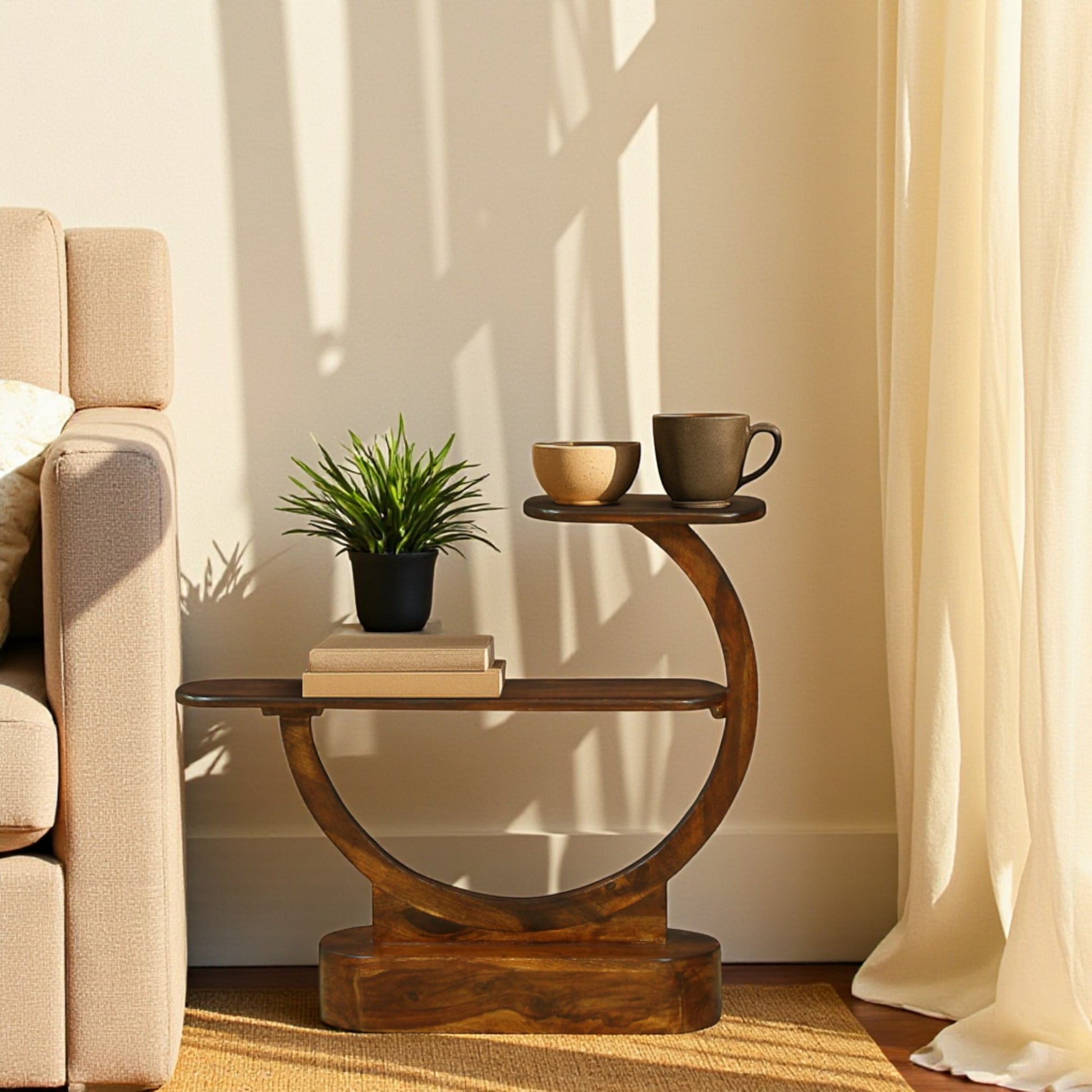 The Wood Curls Curvea Sheesham Wood End Table combines simplicity with artistic elegance. Crafted from solid Sheesham wood and hand-polished to a rich walnut brown finish, its curved silhouette and dual-tier design offer both style and practicality. Ideal for placing books, a coffee cup, or a small plant, it fits perfectly beside your sofa or lounge chair, elevating your living space while keeping essentials close at hand. With its modern minimalist appeal and durable craftsmanship, this end table brings warmth and function to any room.