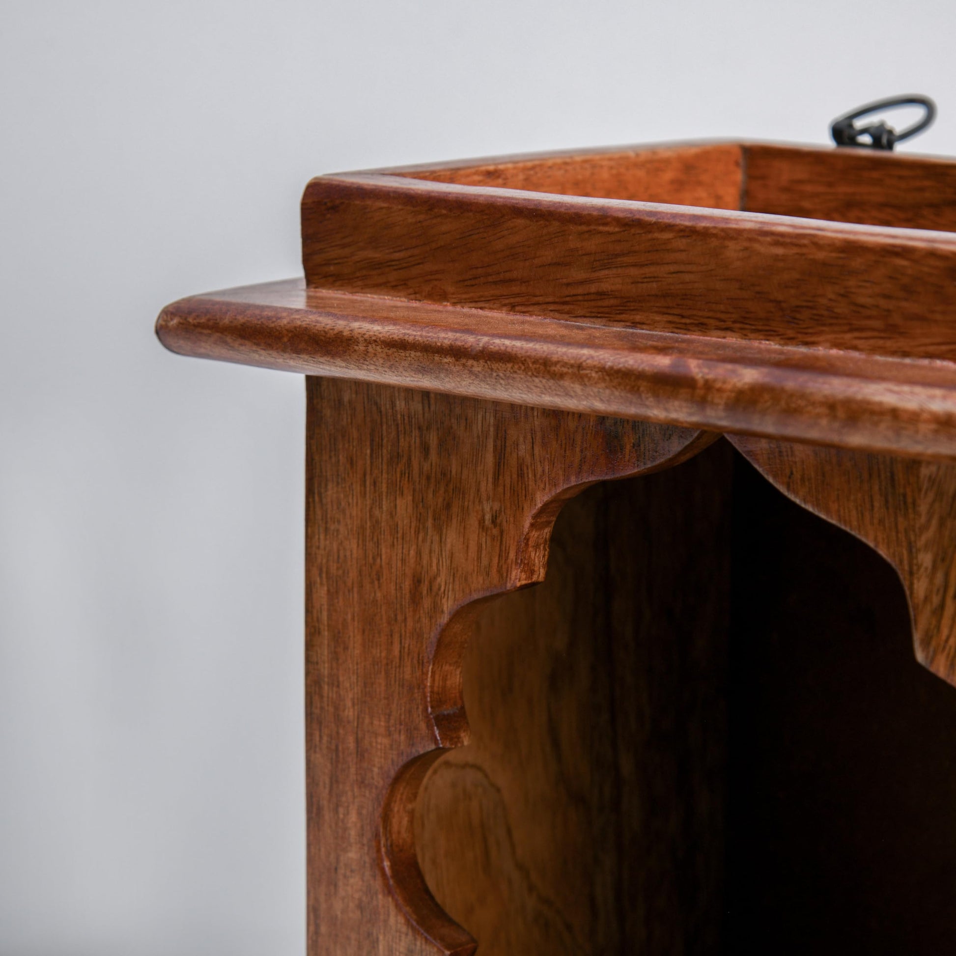Transform your sacred space with this beautifully crafted wooden wall-hanging Pooja temple. The traditional arch design, reminiscent of classic Indian temple architecture, adds an elegant touch to your home shrine. Crafted from premium Sheesham wood with a rich brown finish, this temple features a distinctive scalloped arch that creates a perfect sanctum for your deities. The thoughtful design includes a sturdy base shelf for placing your religious items and wall-mounting fixtures for secure installation. This compact temple serves as both a functional worship space and an aesthetic addition to your home décor. The natural wood grain adds character while maintaining a timeless appeal. Perfect for apartments and homes where space is at a premium, this wall-mounted temple offers a dedicated space for daily prayers without occupying floor area. The simple yet graceful design makes it suitable for both traditional and contemporary home settings. Regular dusting with a soft cloth will help maintain its pristine appearance.